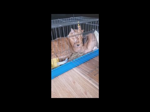 Наглый котик занял клетку кролика.
